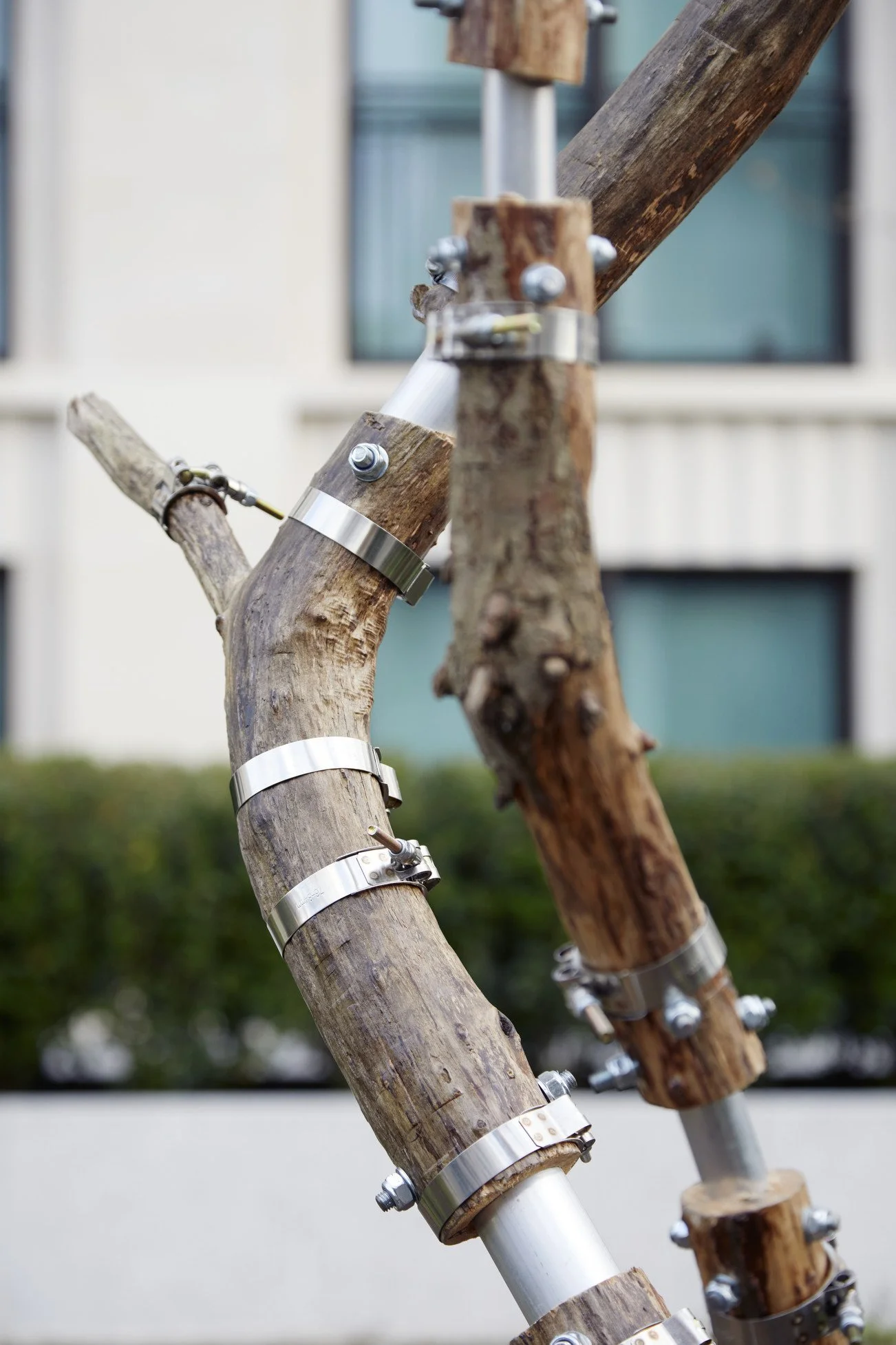 The piece is inspired by the artist’s time spent in China during the pandemic. As safety precautions, scaffolding was used to delineate communities by the Chinese authorities. These industrial blockades might have been seen as impositions, as eyesores. Instead the local communities began to use them to dry laundry, create cooling shade and places to congregate. They started to fulfil the functions of trees, so this sculpture blurs the line between the organic and man made.